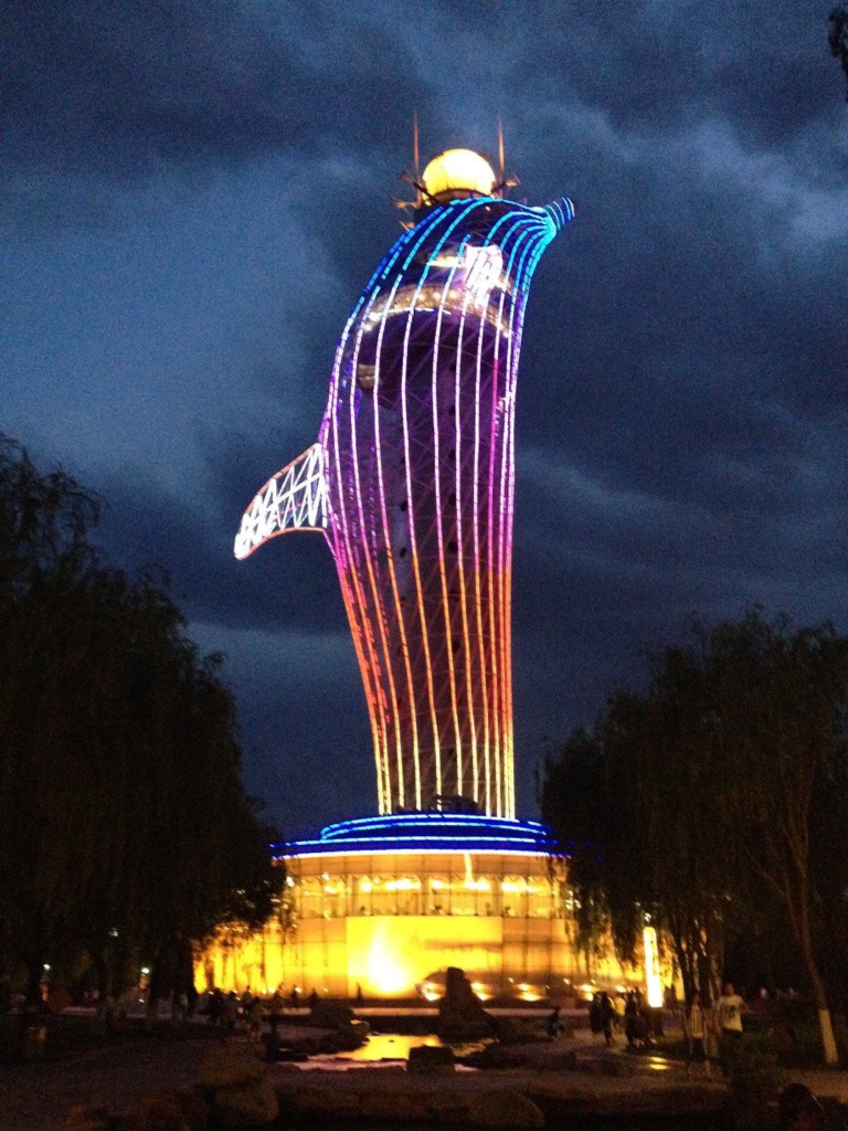 It would be best to walk around Dong Hu Park while there is still a bit of sunlight out so you can enjoy the scenery of the park. Then, once dusk is approaching head up to the observatory (top) floor in the Dolphin Museum so you can see the sunset on the city of Jia Yu Guan. Then as you exit the Dolphin Museum it will be dark and you will be able to see the dolphin lit up from outside the building.