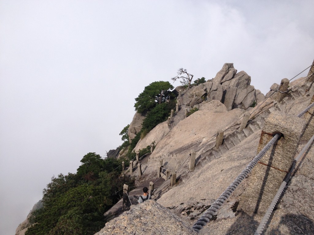 Tian Du Feng is the highest hike-able peak on Mt. Huang.  This is the peak with the notorious 1,300 steps that are just about nonstop (not many places to rest other than the steps) that head straight up into the clouds.  Now, ordinarily being on a mountain peak above the clouds would be incredible, having a bird’s eye view of the surrounding area would make for great pictures and lasting memories.  However, that is not the case with Tian Du Feng.  On this peak you are not above the clouds you are in the middle of them.  Therefore, the clouds surrounding you at the top only serve to hinder your vision and obstruct any views that you might have had.  It was a bit frustrating to be honest, to climb up so many stairs and not be rewarded with any scenic views.  The best comparison would be the equivalent to standing in a thick fog.  I am sure the cloud conditions vary and change from day to day, so my experience may have been rare.  Take it into consideration and with a grain of salt if you’re thinking about hiking the Tian Du Feng Peak.